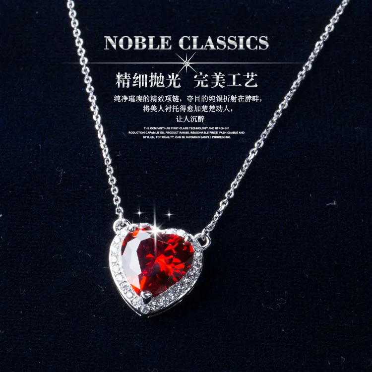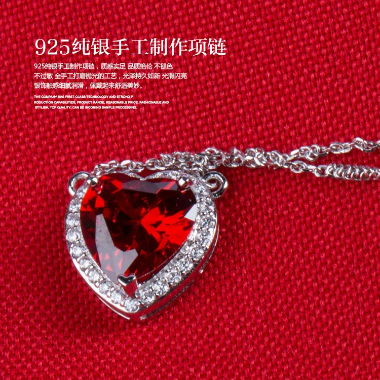 famous brand 925 Sterling silver women jewelry heart shape pendant love necklace fashion garnet red