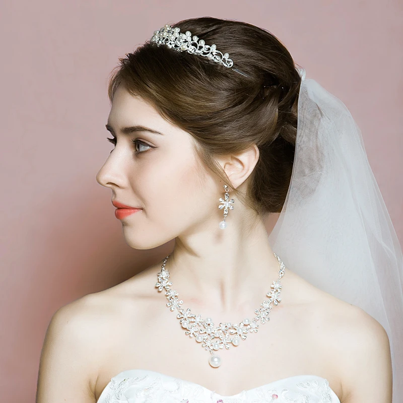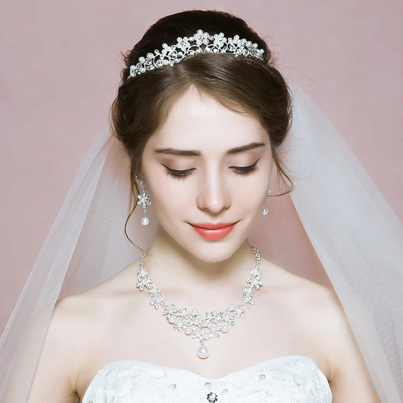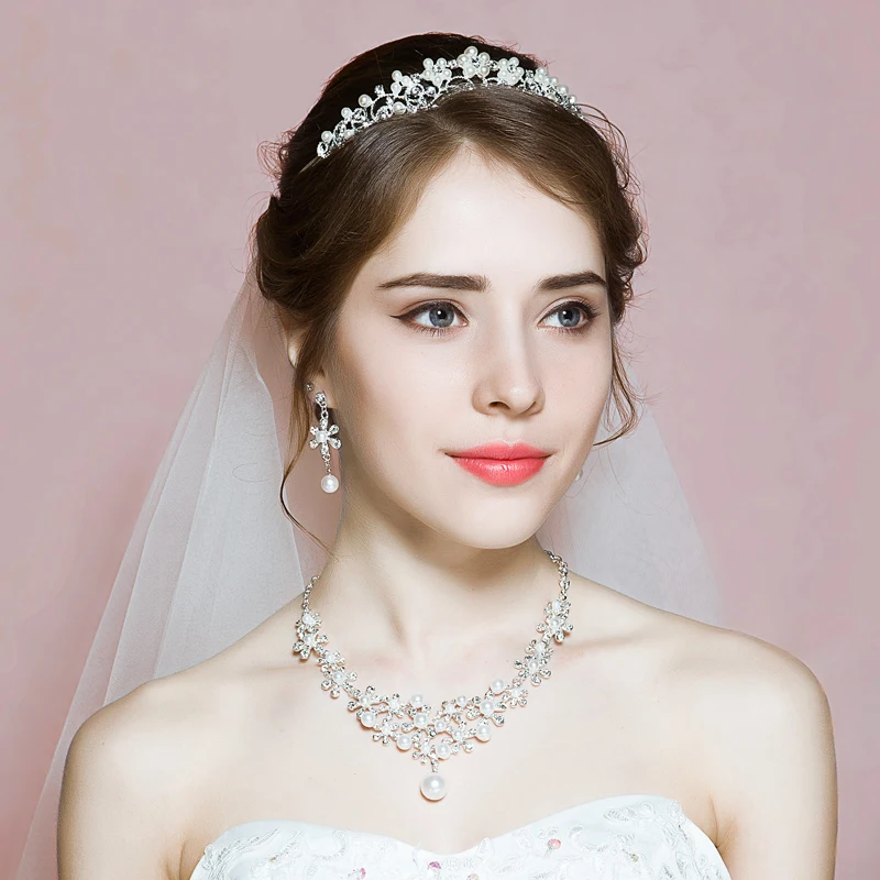HOT SALE Fashion Princess Crown Pearl Wedding Jewelry Sets Women Tiara Necklace Earrings Bridal Accessoires