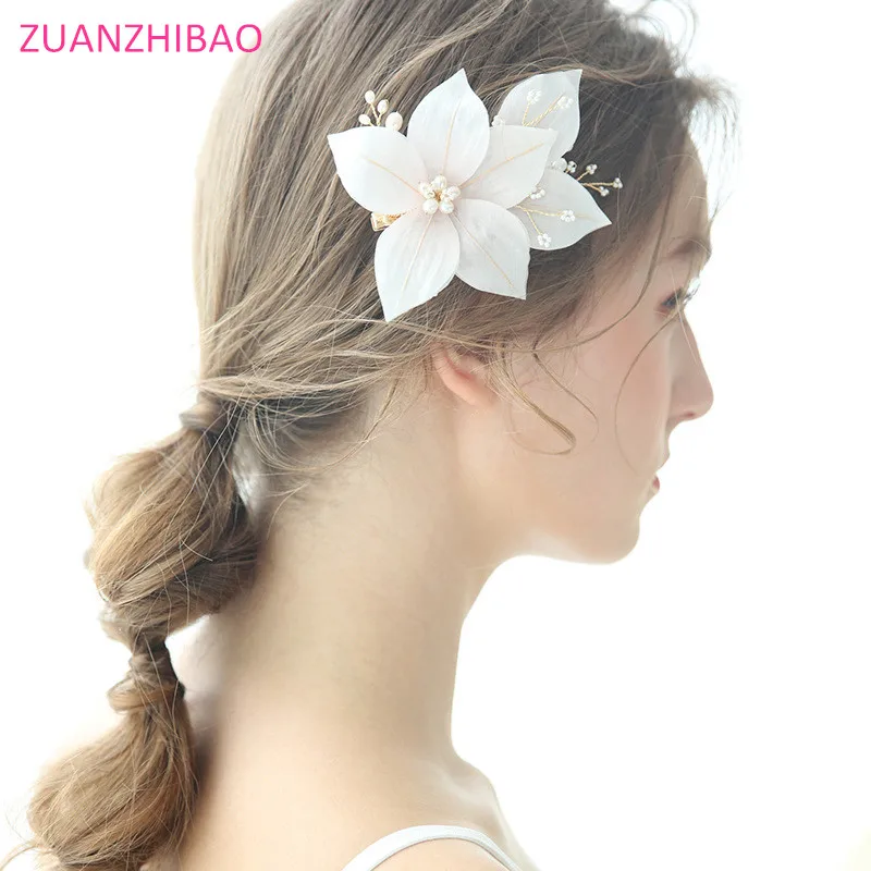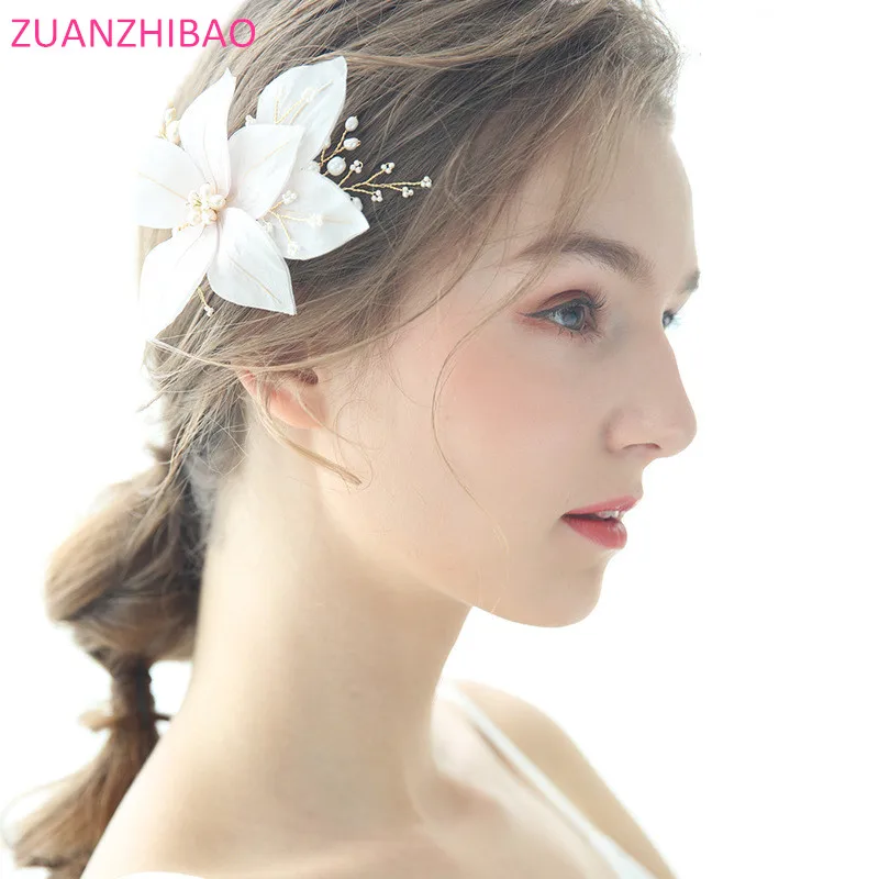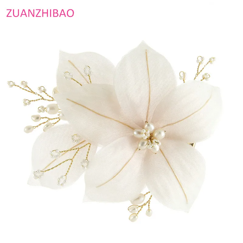 Bridal Hair Flowers Handmade Chiffon Freshwater Pearl Headdress Prom Wedding Hair Accessories Gold