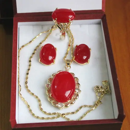 BEST Women's Lovely latest Inlay red stone Necklace Earring Ring set gem jewelry Silver Quartz stone Cry