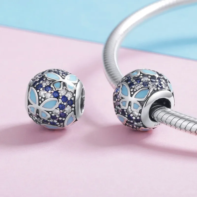 New Arrival 925 Sterling Silver Butterfly Dream Blue Enamel Clear CZ Charms Beads fit Bracelets Nec